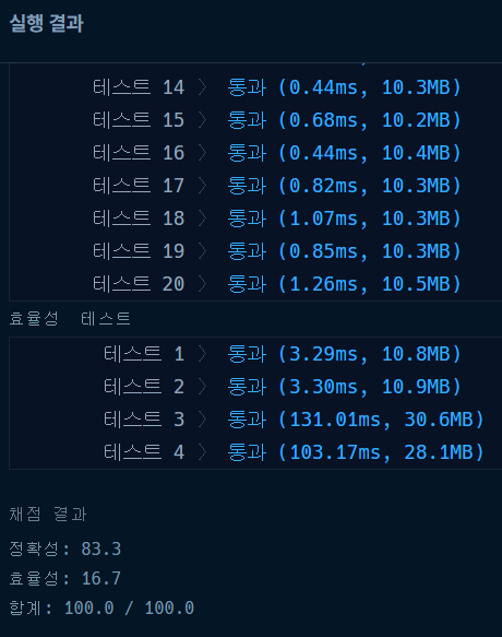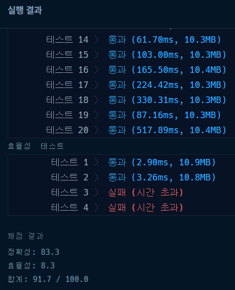- 정확성 테스트에서는 만점을 받았지만 효율성 테스트에서 시간 초과 판정을 받았다.